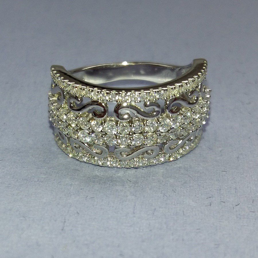 Anel prata banho ródio com trabalhado em meio aro sendo: duas fileiras ao centro e duas no contorno com zircônias, duas fileiras desenho vazado.Medidas do trabalhado: 1 cm de largura e somente em meio aro.(Obs: Todas as medidas são aproximadas e baseadas nas extremidades maiores do produto).