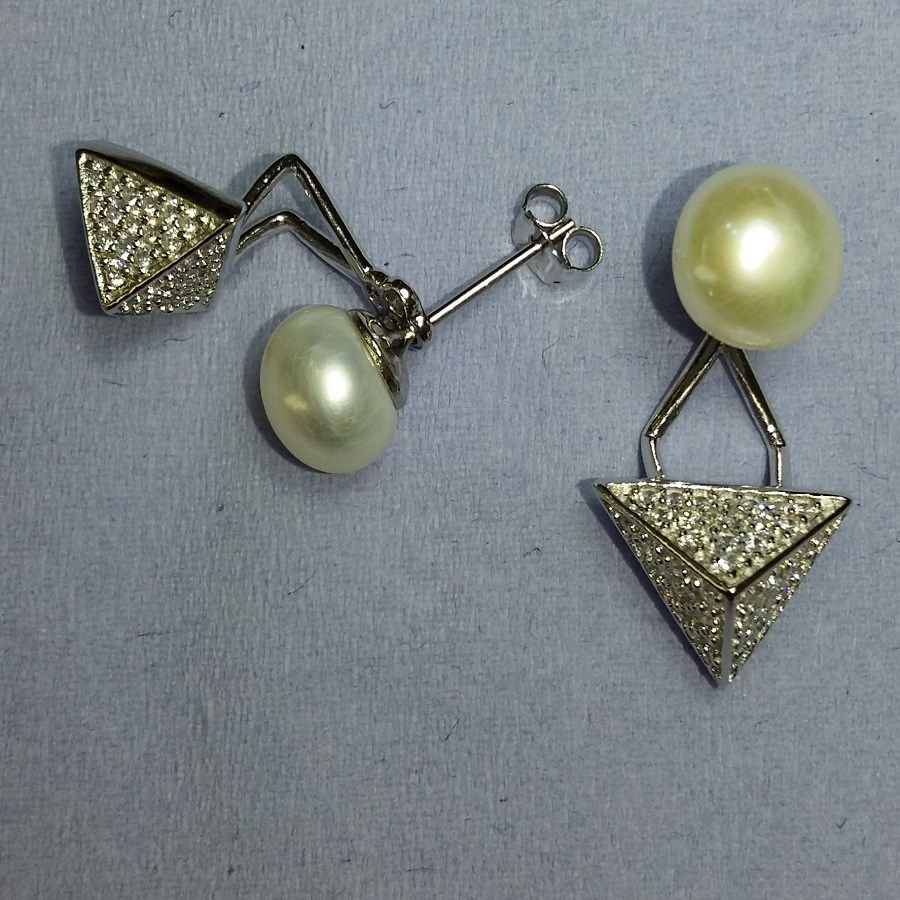 Brinco ear jacket prata banho ródio com pérola água doce e pirâmide com zircônias.Medidas: 2,1 cm de comprimento e 1,2 cm de largura.(Obs:Todas as medidas são aproximadas e baseadas nas extremidades maiores do produto).
